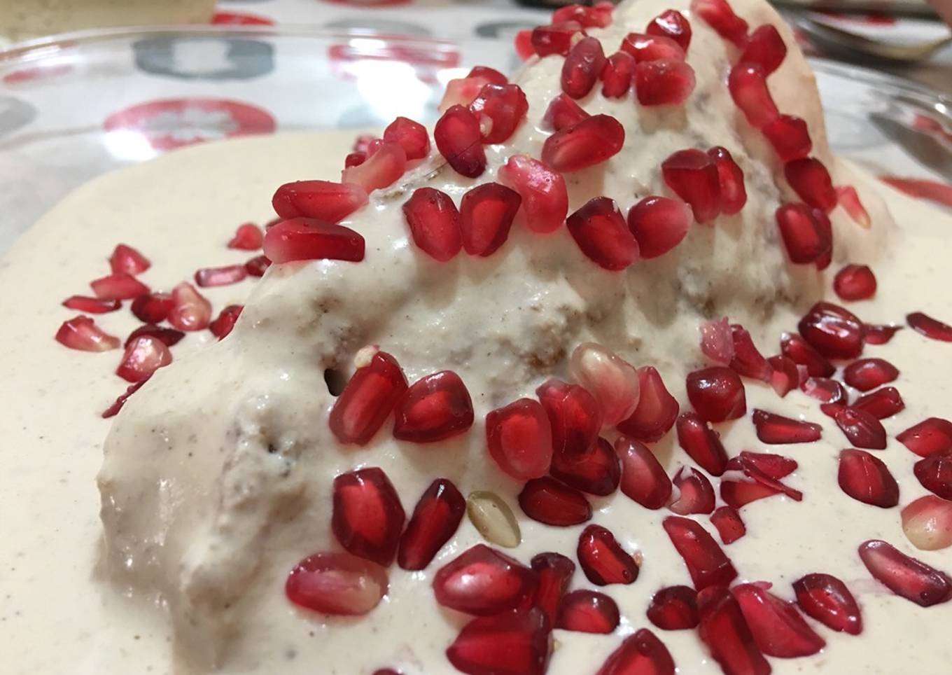 - Entibia la carne que usarás rellena el chile tibio(yo lo puse relleno al darte, cubre con la nogada y adorna con granada.