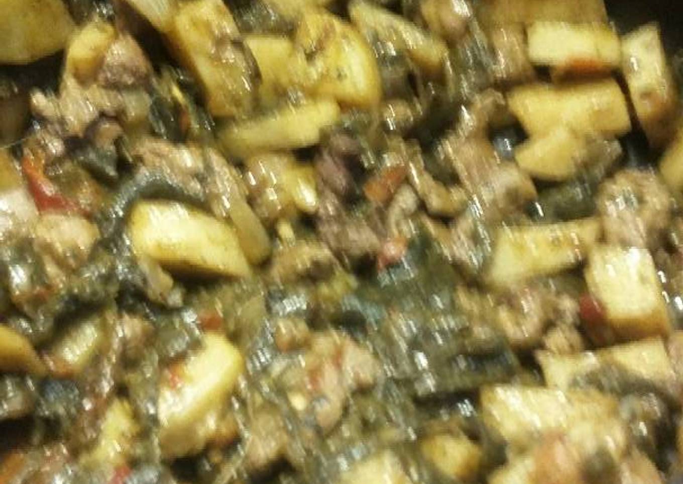 - Se frie la carne en cuadritos, se sazona con sal y pimienta, se le agrega la cebolla y el ajo, y las papas y el chile pasado en cuadros, se le agregue agua para que no quede seco.