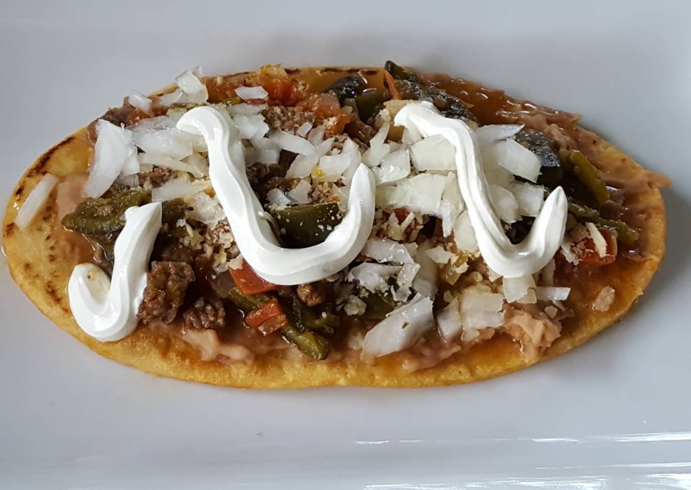 - Pon sobre un plato y unta con los frijoles fritos. Agrega el guiso de carne. Ponle el queso y la cebolla picada.