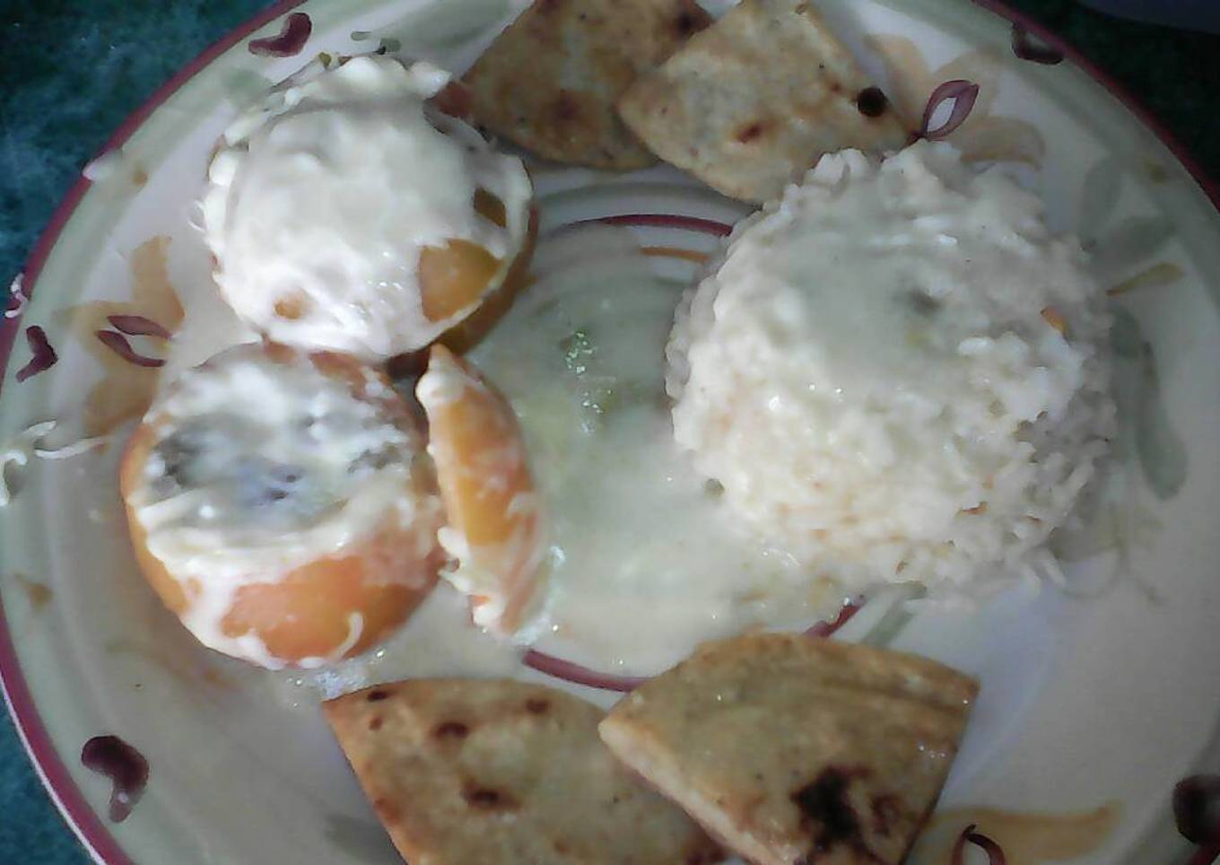 Tomates rellenos de carne y queso con salsa de loroco