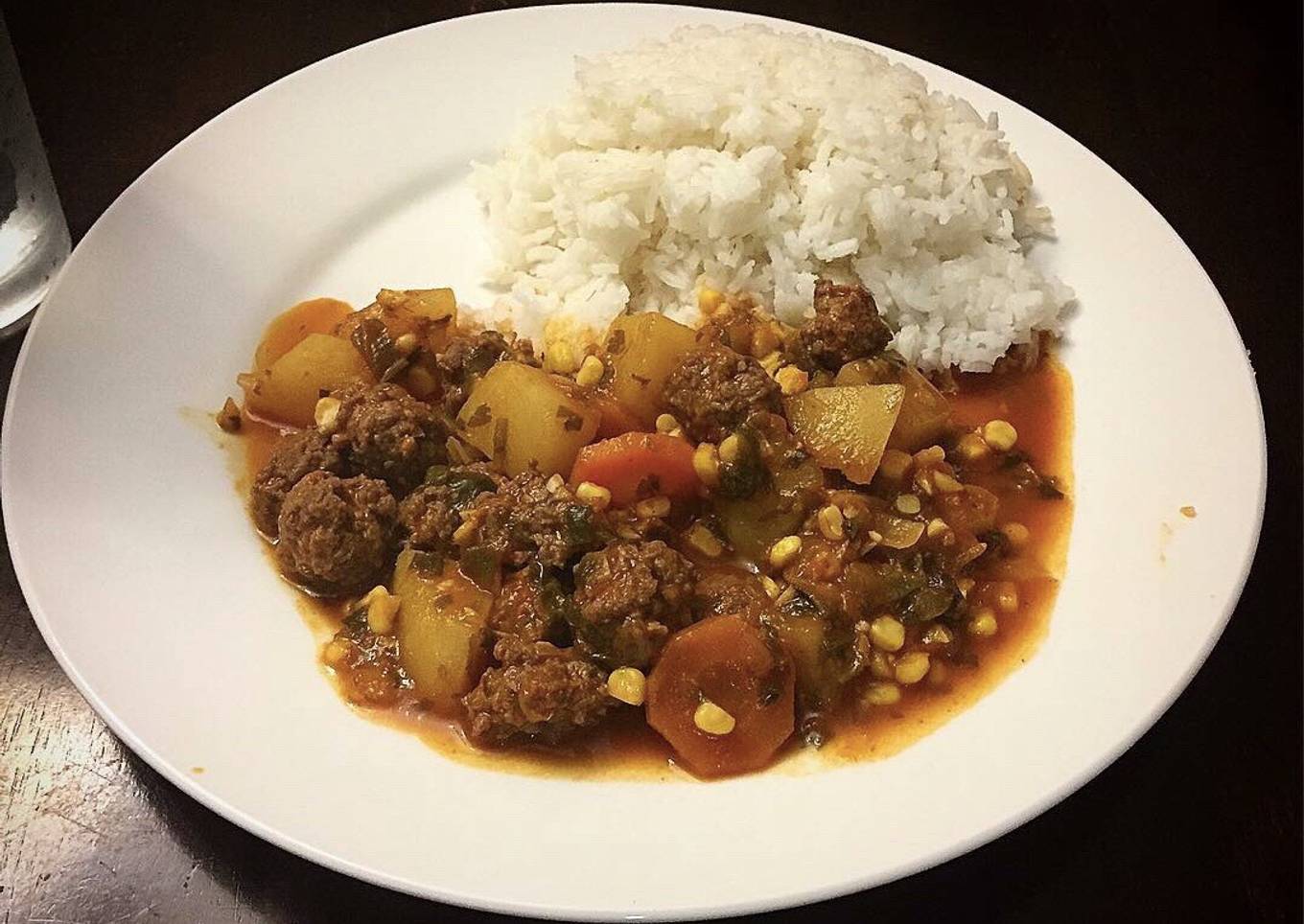 - Pasado los 5 minutos, adentro las albóndigas y cocinamos a fuego medio por 30 minutos. Evitar que el caldo se reduzca por debajo de las albóndigas, puedes corregir sobre la marcha con caldo de pollo, solo toma en cuenta que 15 minutos antes de apagar no debes agregar nada de líquidos, porque deshaces el sabor, y tendrías que dar 15 minutos más, lo cual puede sobre cocer los vegetales o la carne. Listo servir con arroz blanco