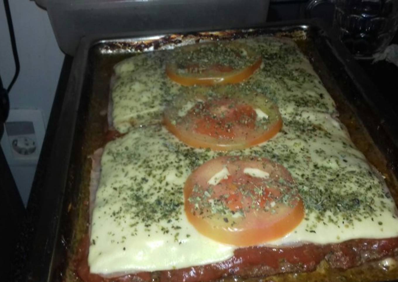 - Sacar de horno y colocar una capa de queso mozzarella, luego tres rodajas de tomates en fila y tapar con la salsa nuevamente. Espolvoreando con orégano.