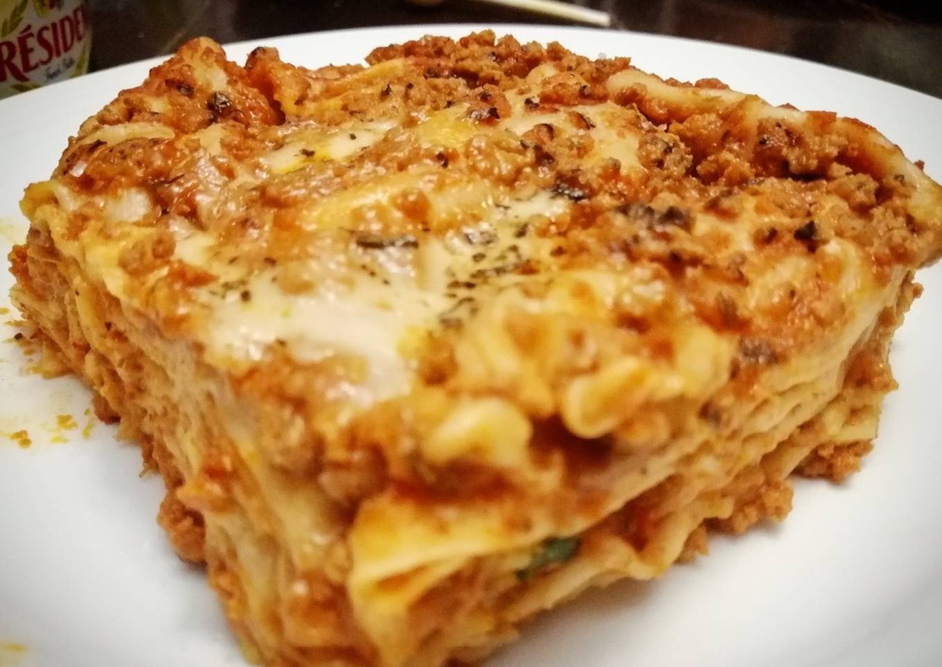 - En un refractario, al menos de 20x30 cm, cubriremos el fondo con una capa leve de salsa y la primera capa de lasaña; luego otra capa de carne y salsa hasta completar 3 capas cubiertas, haremos dos capas con salsa y el queso mozzarella; y una capa final con salsa y carne de relleno y de cubierta. Lo tapamos y lo llevamos 40 minuto al horno a 180°C. Luego destapamos, y doramos por 5 minutos más.