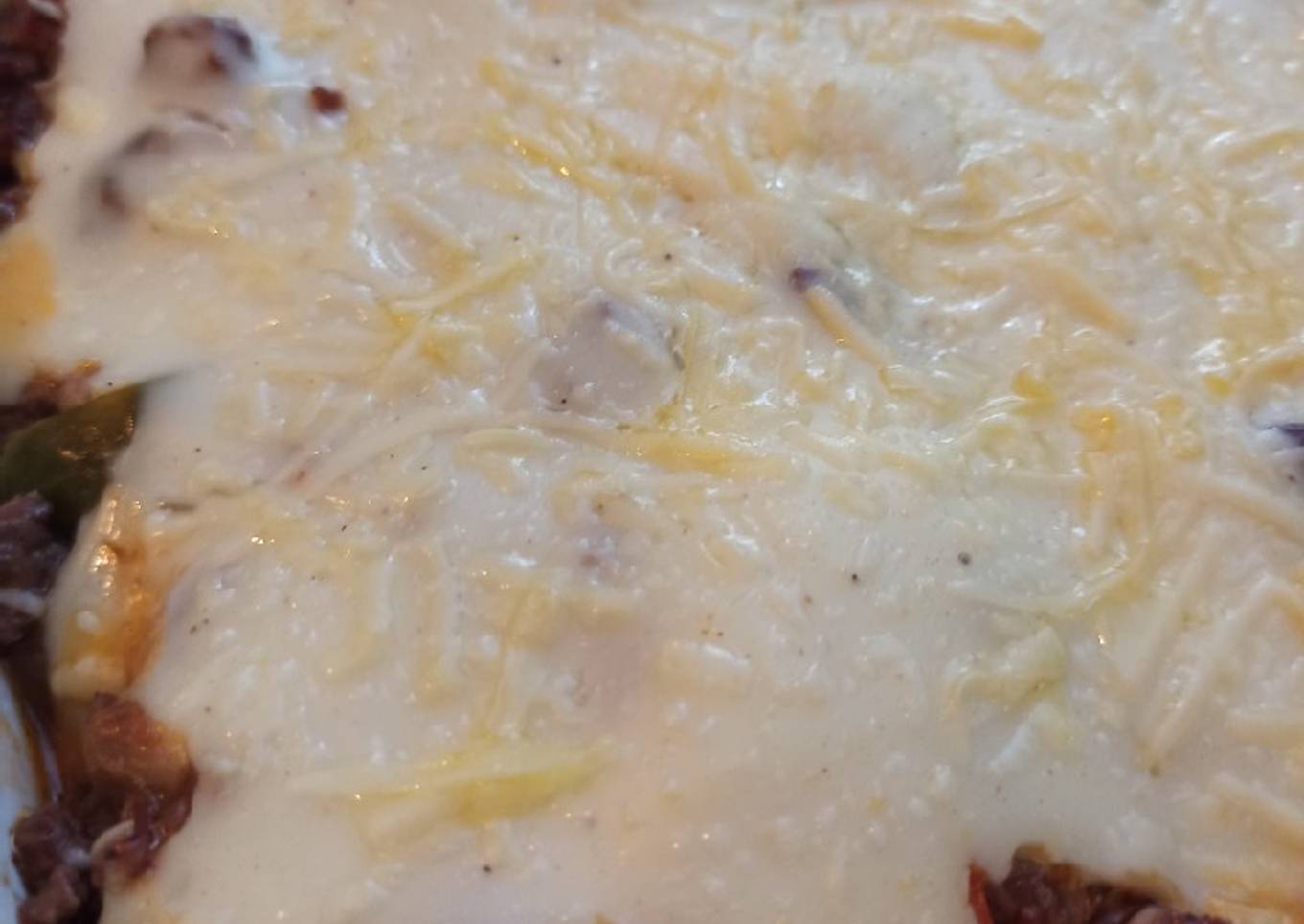 - Preparé la salsa blanca tal como indica el paquete y puse sobre la carne. Agregué un poco de queso rallado y al horno por 25 minutos.