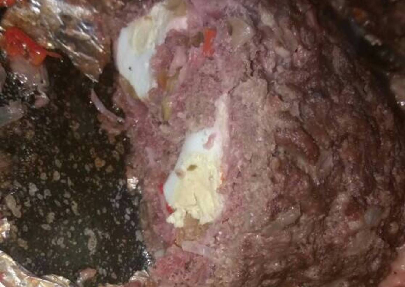 - Luego comienzo con el relleno. Pongo la paleta y el queso barra, el morrón crudo en tiritas, y los los 3 huevos duros(cocidos).