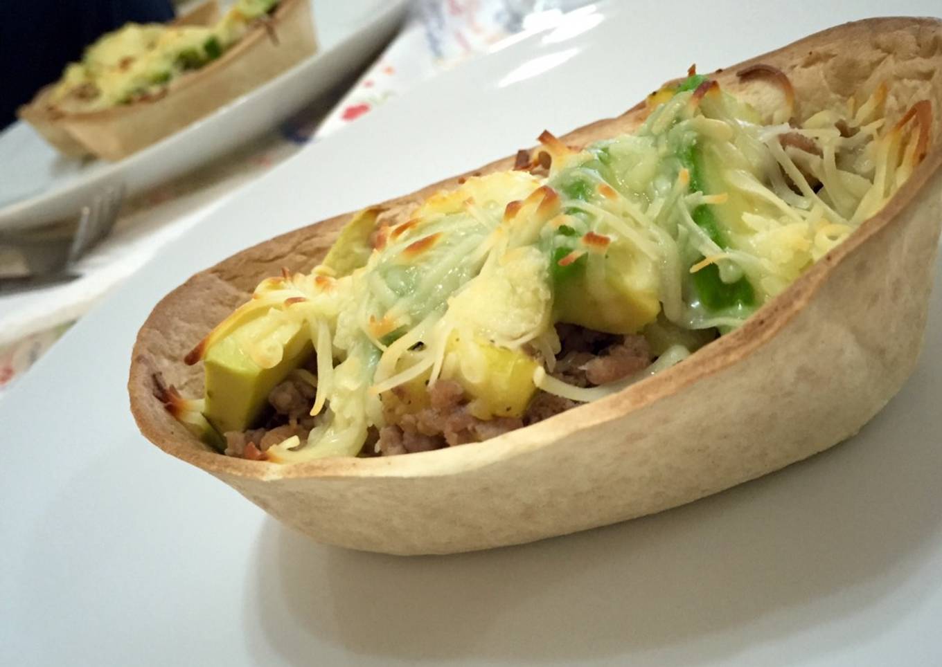 - Ponemos en las barquitas. Colocamos tiras de aguacate sobre la carne y cubrimos todo con el queso rayado