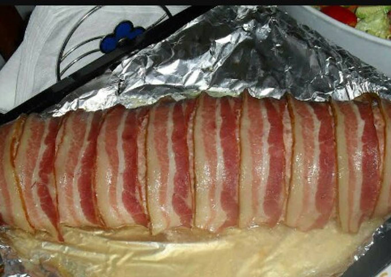 - Luego coja la tocineta lasca por lasca y en envuelva completamente la carne..